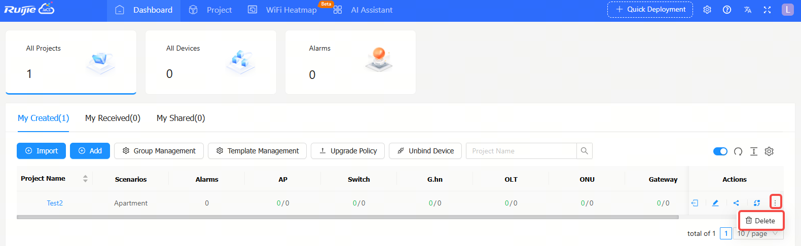 (2) If a project has a device bound to it, it cannot be deleted. To delete it, please remove the device from the project first.