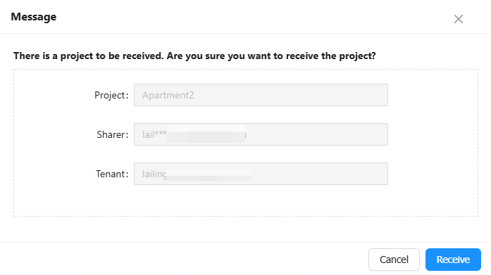 (2) Sharer: Displays the tenant account to which the shared project belongs.