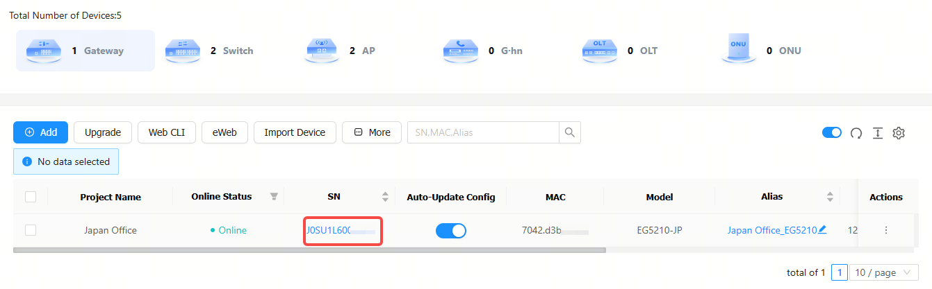 : Search box. Supports searching gateways according to their SN, MAC addresses, and aliases.