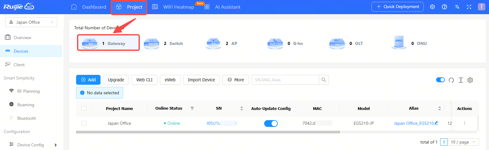 Navigate to Project > Gateway to go to the gateway management interface. After selecting a specific project, you can manage the gateway devices in this project.
