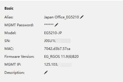 The basic information tab displays the alias, the model, the SN, the MAC address, the firmware version, the management IP and the description of the gateway. Click the edit icon next to the alias, description and management password to edit them.