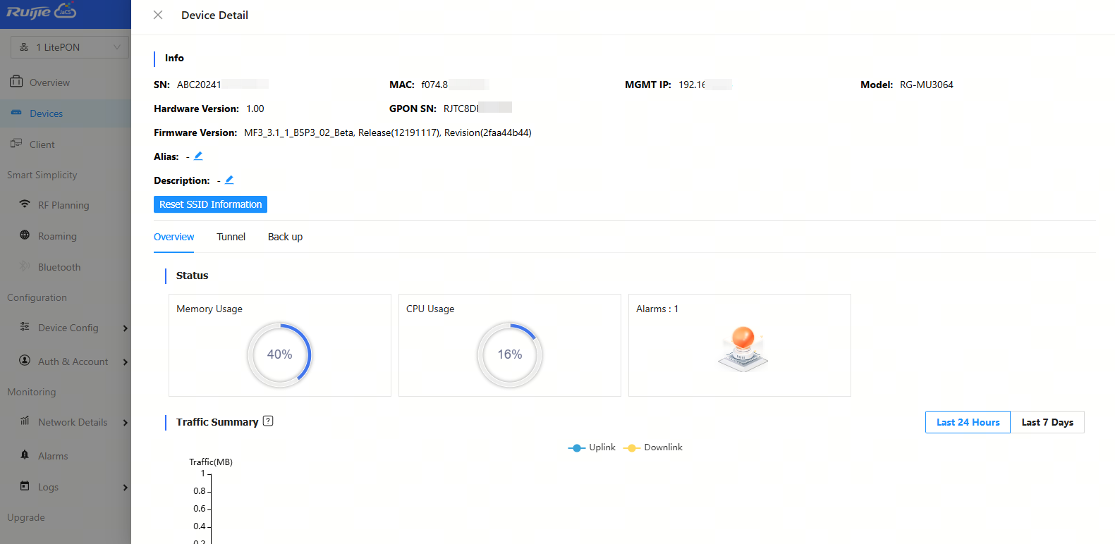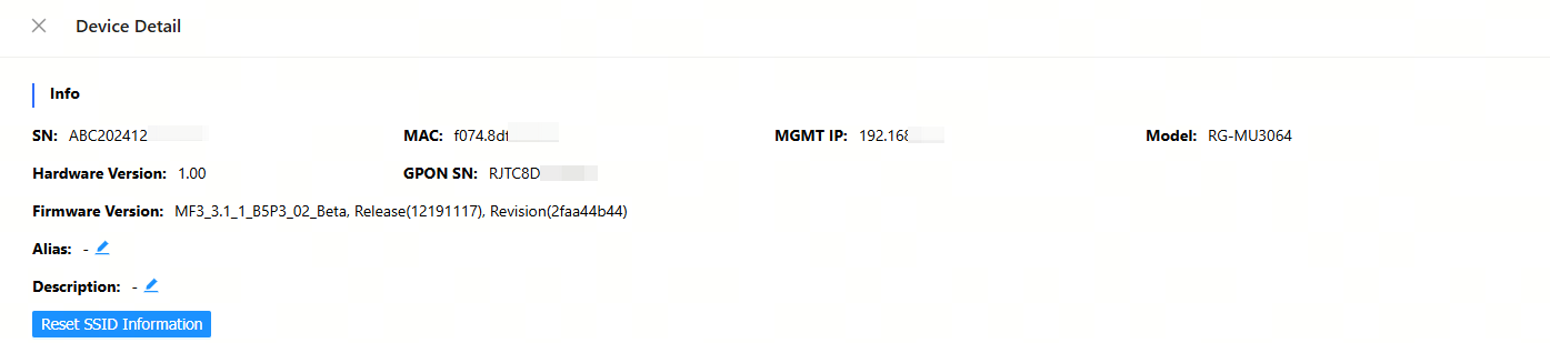 The device information displays the device’s SN, MAC address, MGMT IP address, model, hardware version, firmware version, alias and description. To reset the device SSID, click Reset SSID Information.