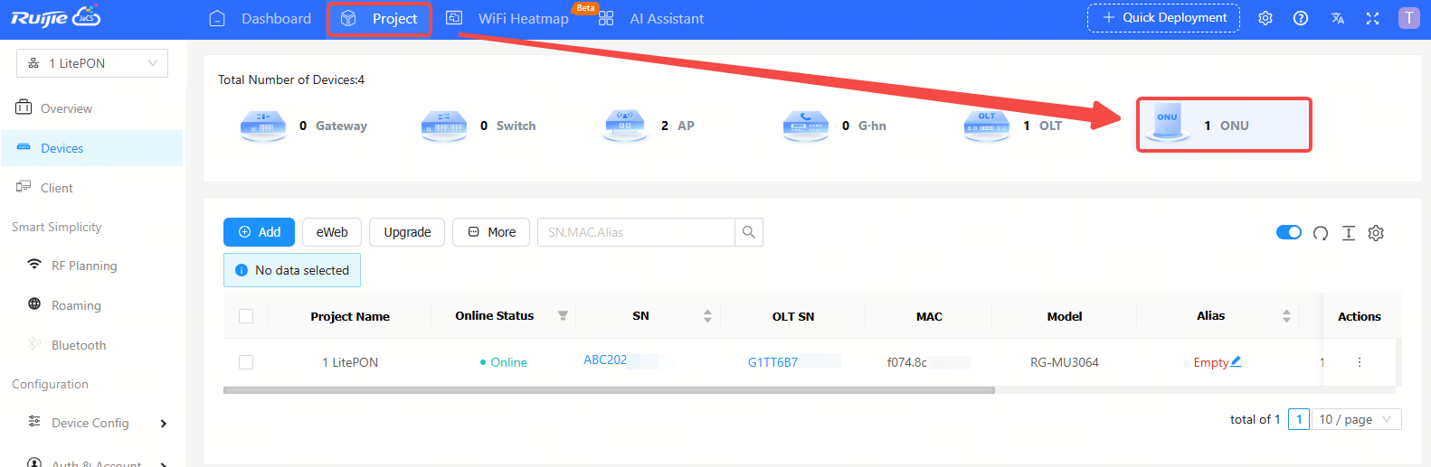 Click Project > ONU to go to the ONU management interface. Click the SN of an ONU, you can view its detailed information.