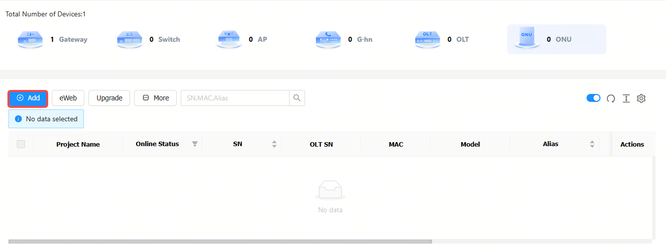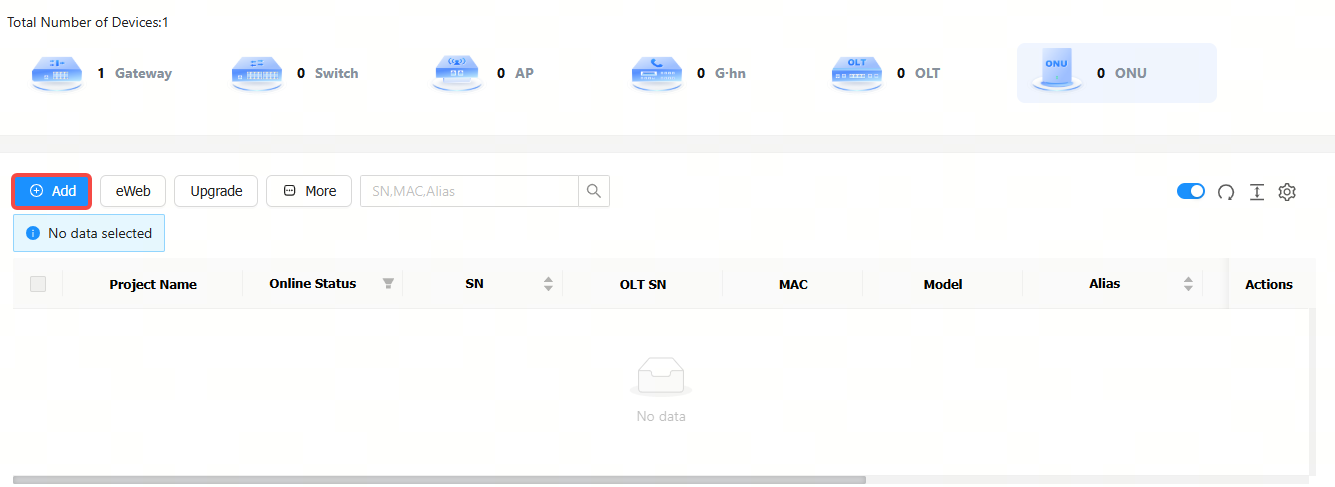 Step 3: Click Add in the ONU management interface.