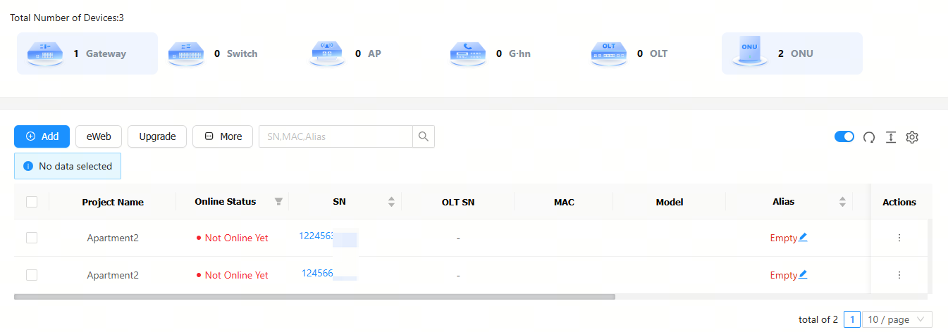 Step 1: Naviagte to Project > ONU to go to the ONU management interface.