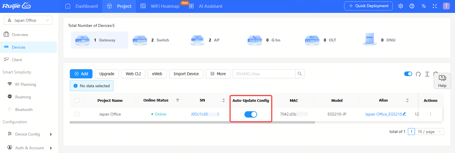 4. Add a switch to enable or disable the function of automatically delivering configurations to an RG-EG5210-JP via Ruijie JaCS.