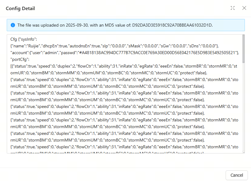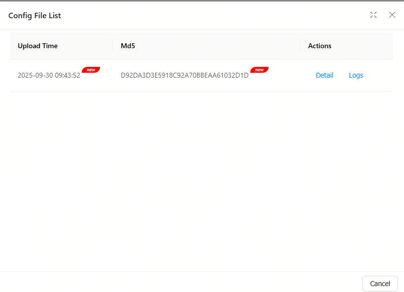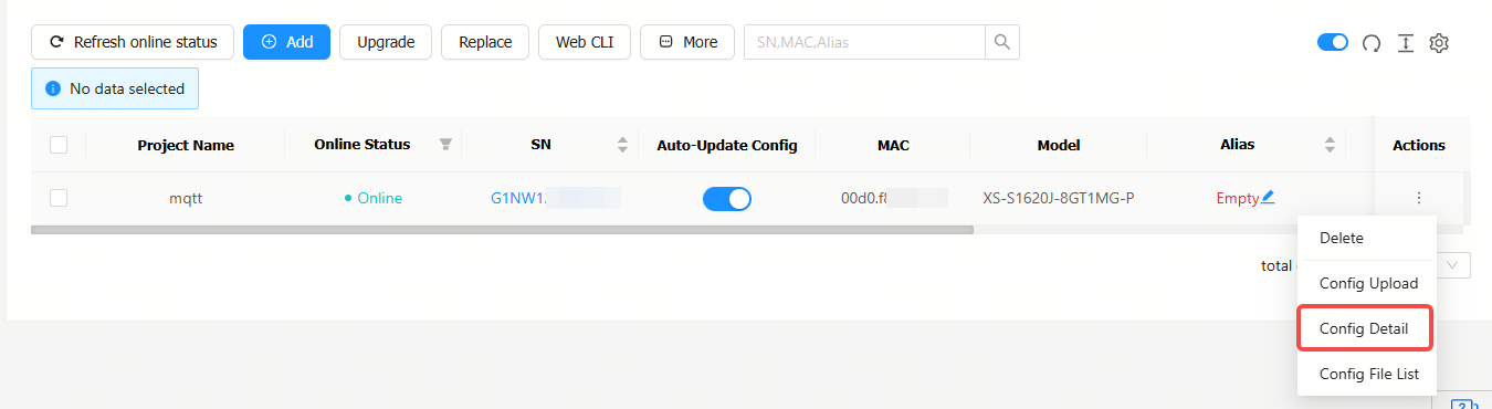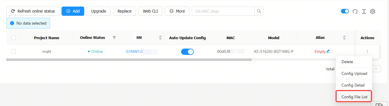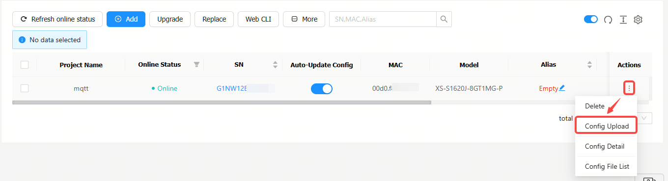 Step 1: Click the icon in the Action column of a XS-S1620J switch, and then click Config Upload.