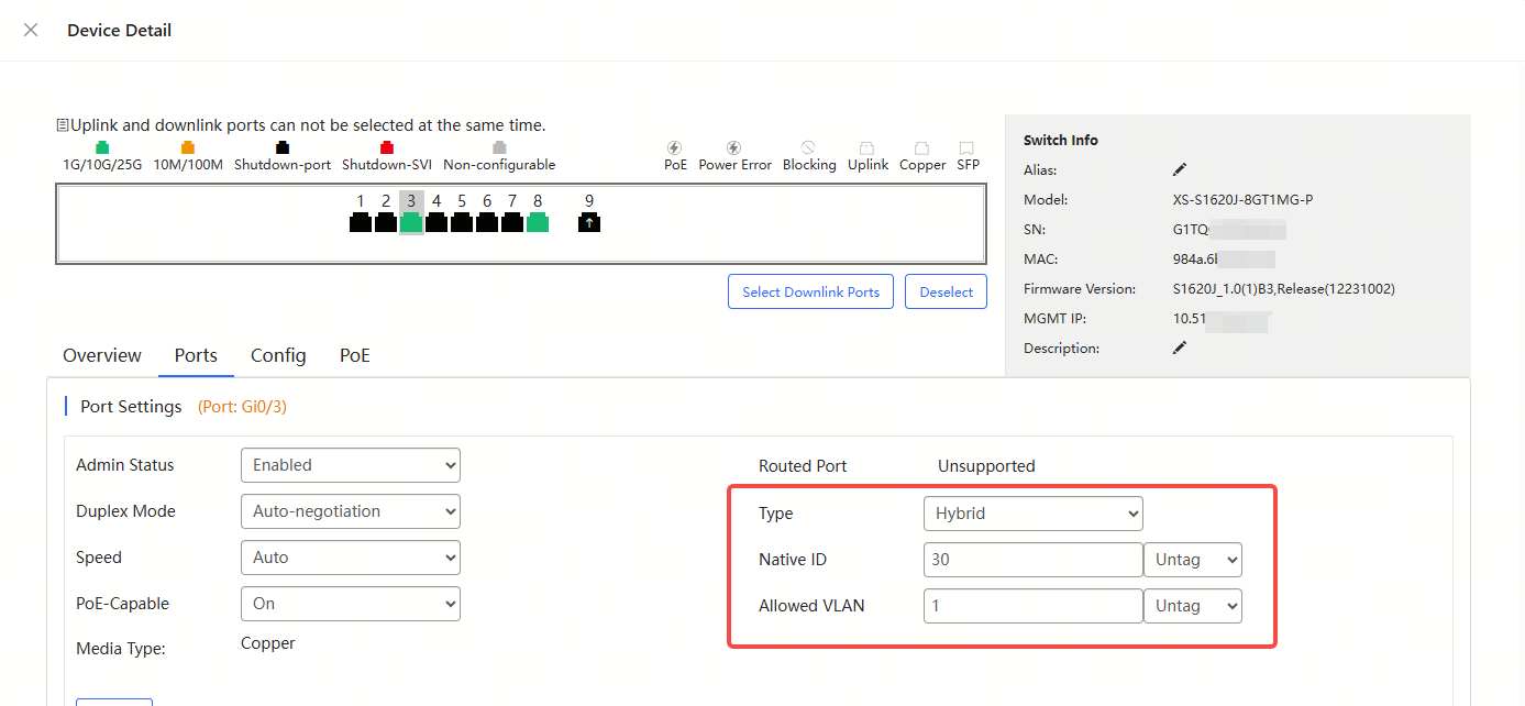 2. You can configure the XS-S1620J switch ports as hybrid ports, and set packets to be tagged or untagged.