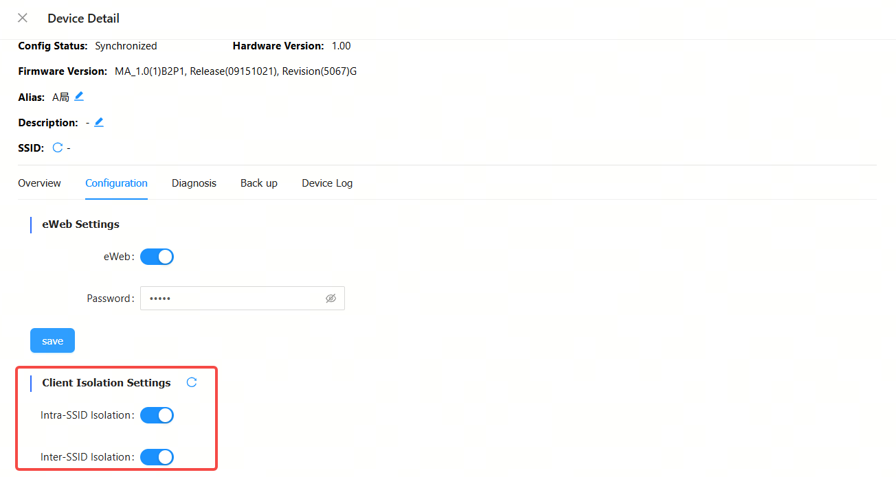 3. Allow to configure the client isolation on the Device Detail page of an RG-MA2810 device.
