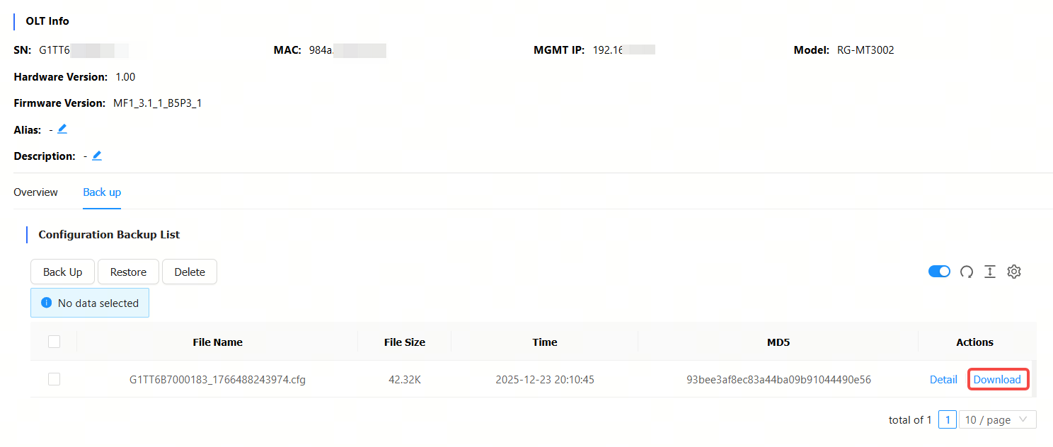 3. Support the display of transmit optical power and receive optical power for the PON interfaces of RG-MT3002 and RG-MU3064.